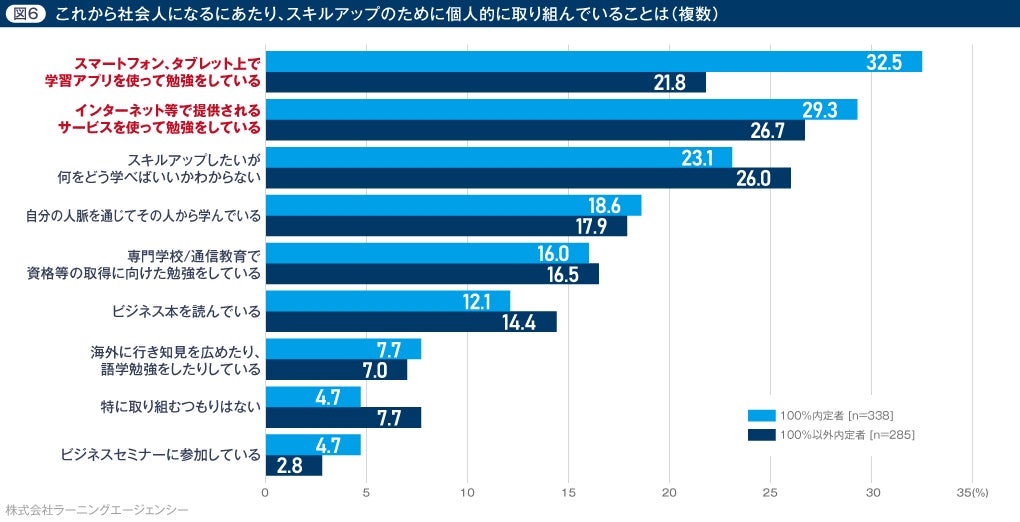 次に、スキルアップのために個人的に取り組んでいることを見ていきます。100%内定者は、「スマートフォン、タブレット上で学習アプリを使って勉強をしている(32.5%)」が最も高く、100%以外内定者よりも10.7ポイント高い結果となりました。一方、100%以外内定者は「インターネット等で提供されるサービスを使って勉強をしている(26.7%)」と「スキルアップしたいが何をどう学べばいいかわからない(26.0%)」がほぼ同数となり、「スキルアップしたいが何をどう学べばいいかわからない」は100%内定者よりも高い結果となりました。(図6)