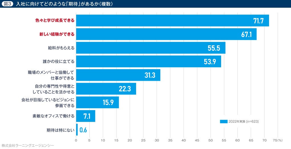 次に、昨年より大幅に増加した「期待」についても見ていきます。入社に向けてどのような「期待」があるかを質問した結果、「色々と学び成長できる」が71.7%と最も高い割合となりました。次に「新しい経験ができる」が67.1%、「給料がもらえる」は55.5%、「誰かの役に立てる」が53.9%と続きました。内定者は社会に出ることに対して不安を抱えながらも、自身の成長や新たな経験へ、前向きに期待していることがわかりました。(図3)