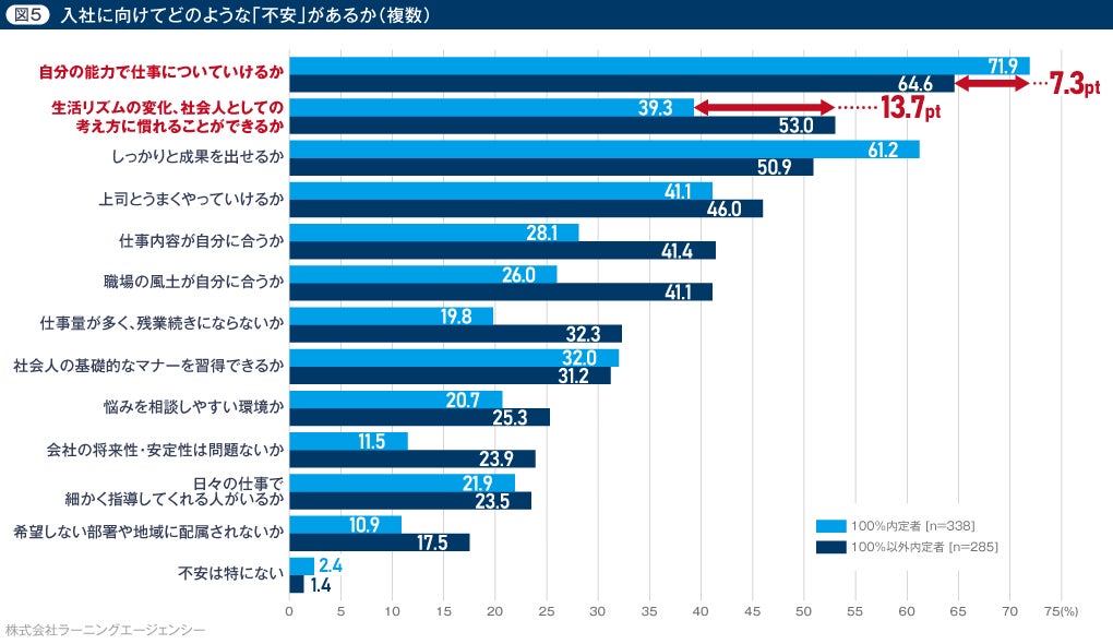 それ以降の項目においても差があり、100%内定者の2位には「しっかりと成果を出せるか」が入りましたが、100%以外内定者では「生活リズムの変化、社会人としての考え方に慣れることができるか」が入り、100%内定者よりも13.7ポイント高く、違いが見られました。半数以上の項目において、100%以外内定者の方が割合が高く、100%内定者よりも様々な不安を感じている結果となりました。(図5)
