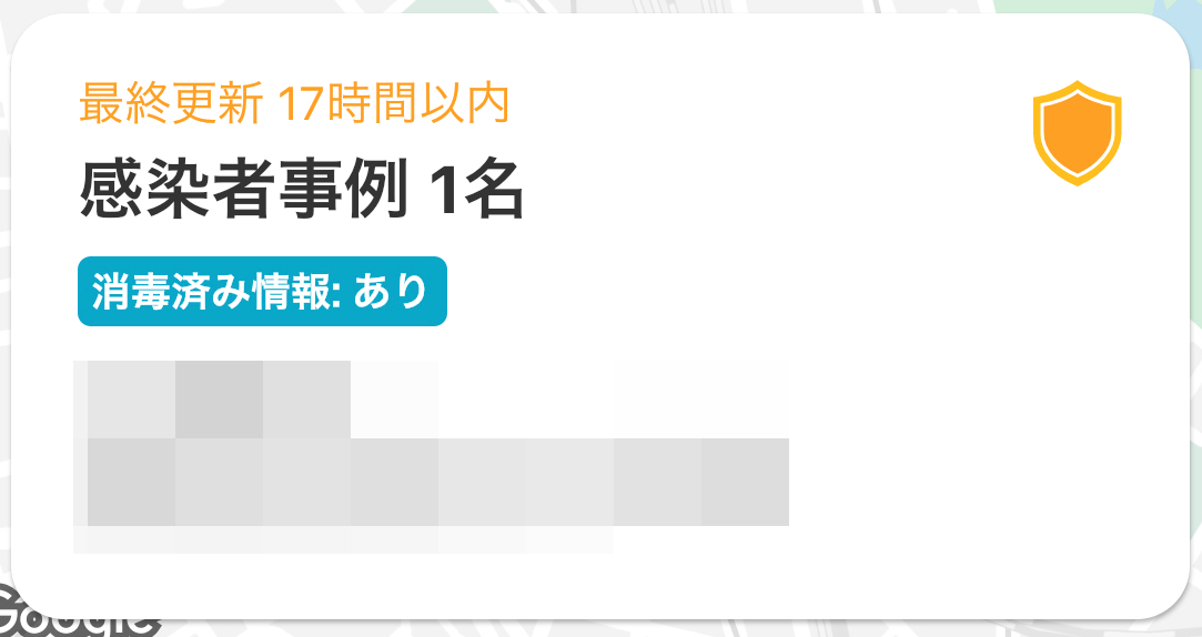 感染事例のある場所のマークの下に、感染事例が生じた時期についての表記が加わりました。また、画面下部の感染事例の情報をタップすることで、その場所での新たな感染者の発表や、消毒済みなどの情報の追加・更新情報も時系列で確認できるようになりました。