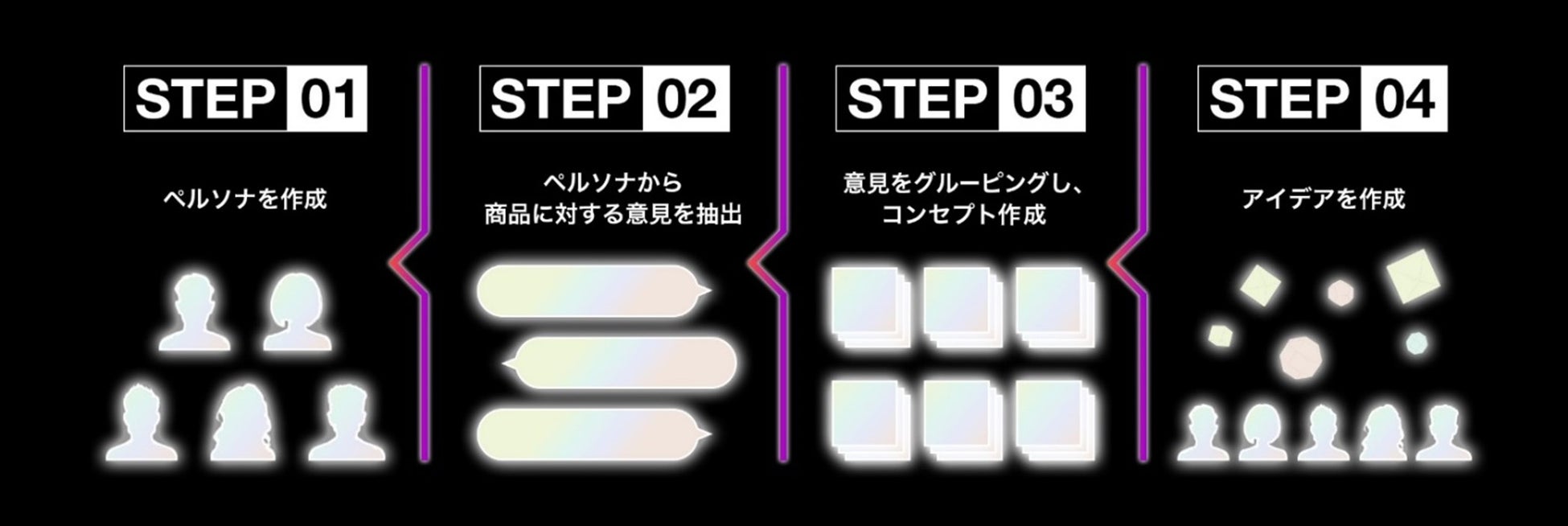 これまで当社が実務を通じて実践してきたアイデア発想フローをAIシステム上に再現。商品・サービスの情報を基に、商品の使用を想定したカスタマー、まだ商品認知をしていないターゲット層の人など複数のペルソナをAIで作り、商品に対する意見を述べさせます。出た意見を取りまとめてコンセプトを作成し、新しい視点のアイデアを生成します。