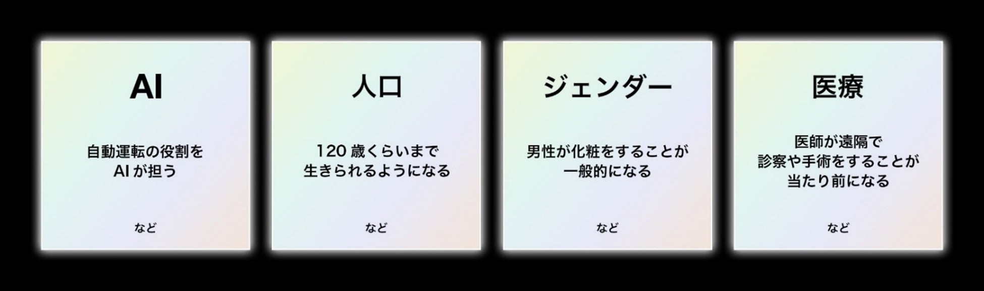 新しい視点でアイデアを生成するために、AI・人口・ジェンダー・医療など様々な領域で当社オリジナルで仮説立てした未来予測を100以上読み込ませています。