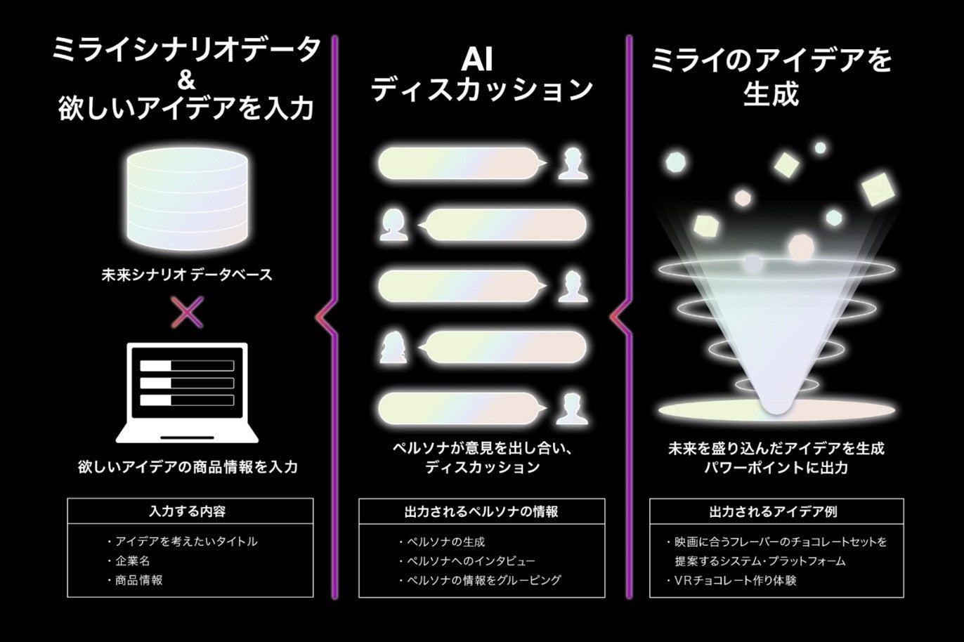 本アプリは、当社が培ってきたアイデア発想フローとAI・人口・ジェンダー・医療など様々な領域のオリジナルの未来予測シナリオを生成 AI へ読み込ませており、それらの情報から新しい視点のミライアイデアを生成します。この生成したアイデアから社員が着想を得ることで、企画・プランニングの充実化を図ります。文字情報だけでなくイメージ画像も生成できるため、アイデア着想の幅を広げる効果が期待できます。また、商品情報などの固有要件もAIに取り込んだうえで、PowerPoint*で出力する仕様となっており、実務的なユースケース、ワークフローに即したものとなっています。