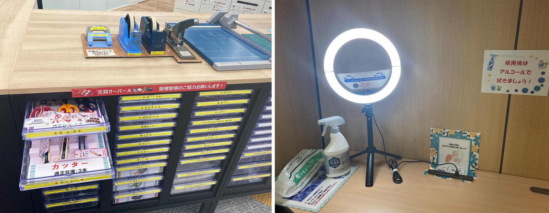 文具サーバーの整備や備品の姿置きなど、お客様が「明日にでも真似できる」そんなツールを、オフィス内のさまざまな場所に散りばめご紹介します。ES(Employee Satisfaction:従業員満足度)向上の観点でおこなう社員の働きやすい環境づくりが、CS(Customer Satisfaction:顧客満足度)向上に繋がります。