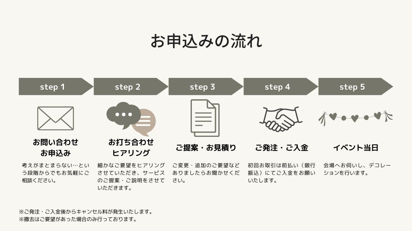 使用する装飾アイテムは、ご予約ごとに発送するため、在庫を抱える必要がなく、保管スペースの確保も不要です。これにより、手軽に洗練された空間演出を実現できます。