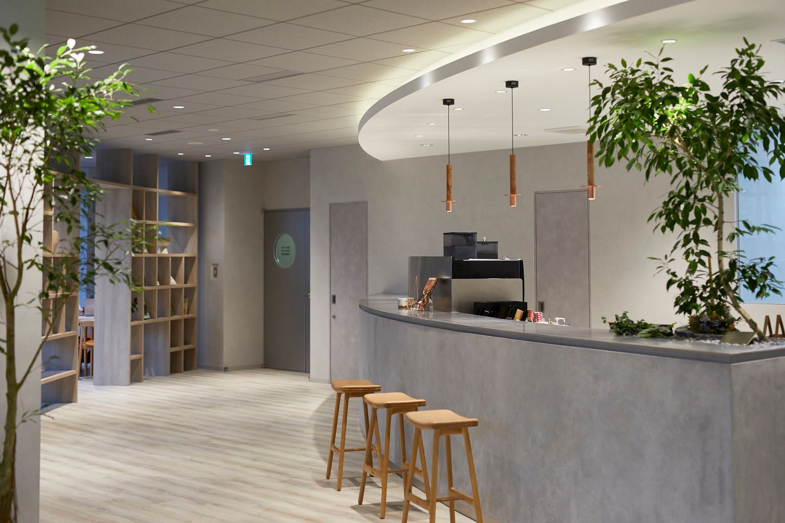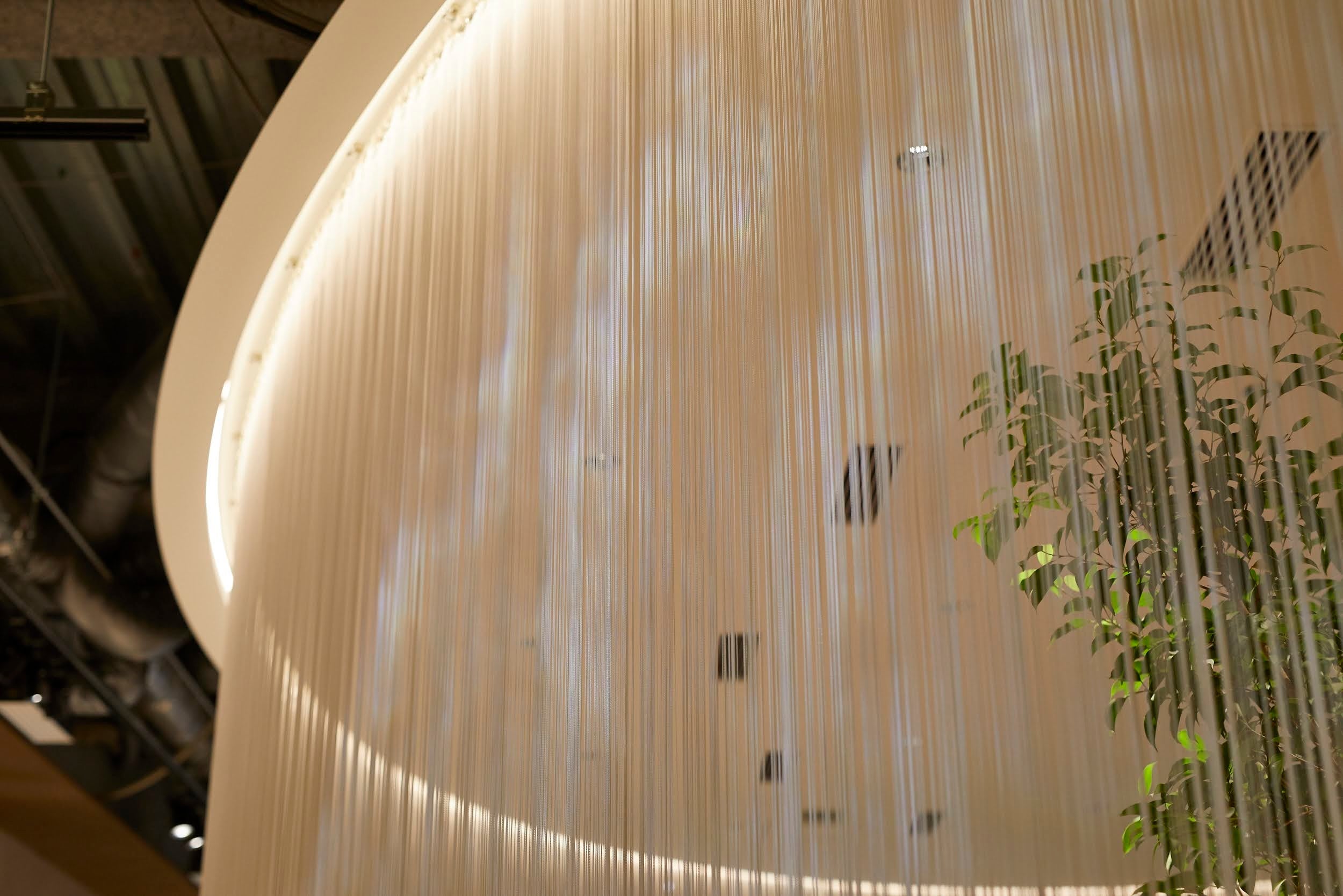 スムフム テラス新宿は高層ビルが立ち並ぶ東京・西新宿エリアに位置しています。一階のオープンラウンジ中央には社名である”積水”をイメージソースにした円形のフリンジカーテンを設置し、水柱を再現しました。ガラス張りのため、外を通る人の目を引く効果も兼ね備えています。