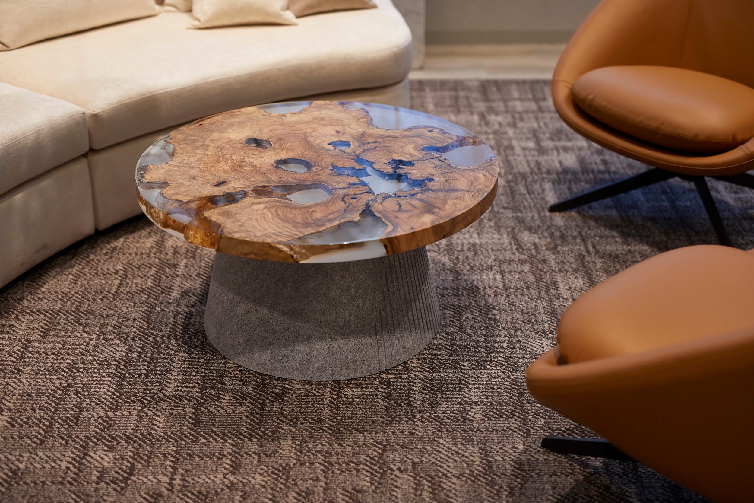 一方、ローテーブルには実用性の低いオリーブの切り株をレジンで整えることで、意匠性を高めながら機能性もプラス。足にはラインを入れて一手間加えた庵治石(あじいし)※2を合わせました。