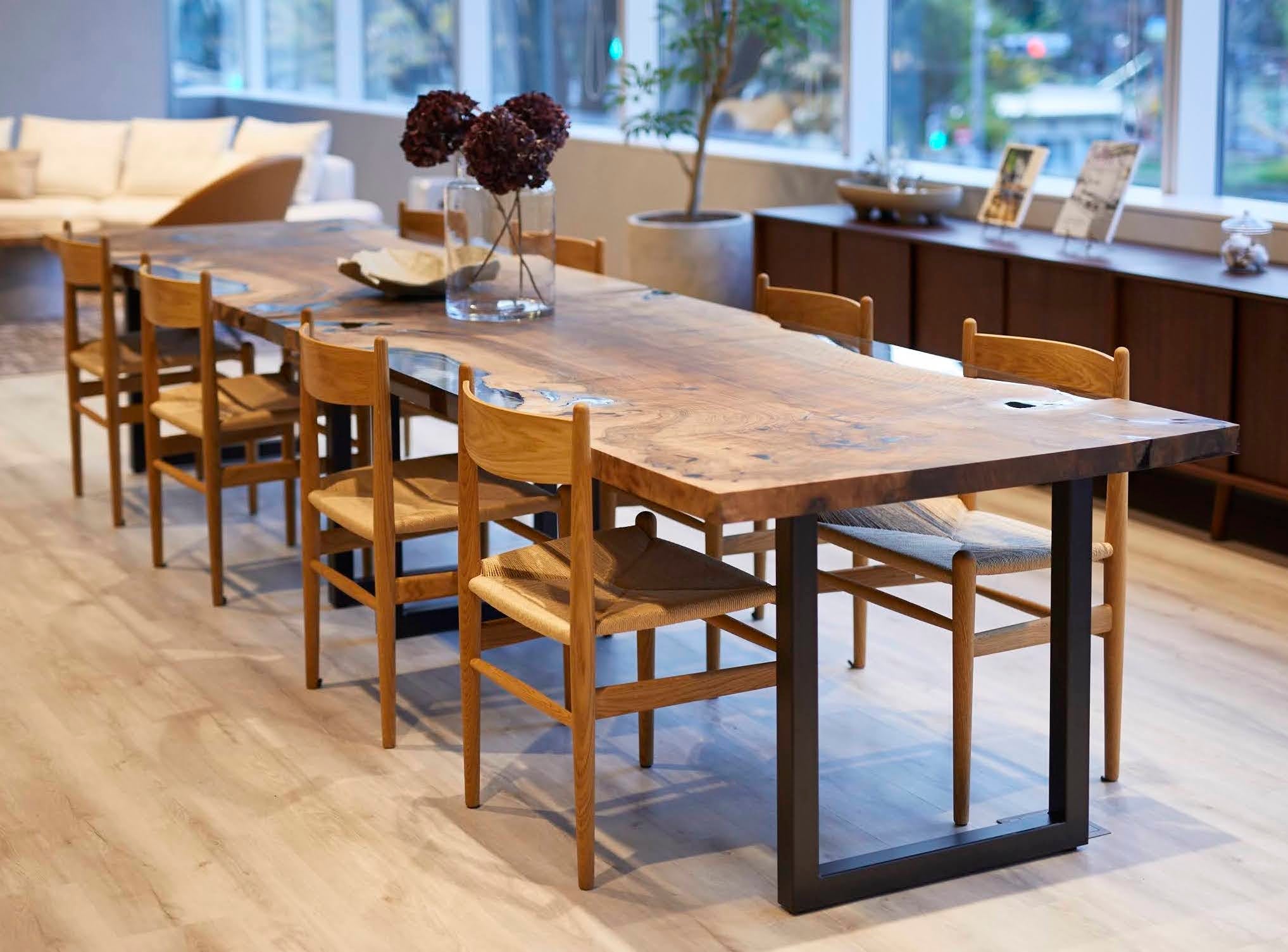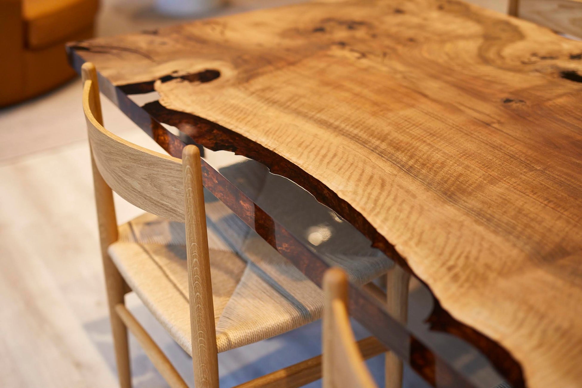 滞在時間中、商談などで、もっとも身近に過ごすであろうロングテーブルもオリジナルで製作。実際に手に触れ、植物の素材感を感じていただけるよう、希少なバストゥーンウォールナット材※1 にレジンを流し込んだテーブルは、木の特性をそのままいかしてデザインしました。