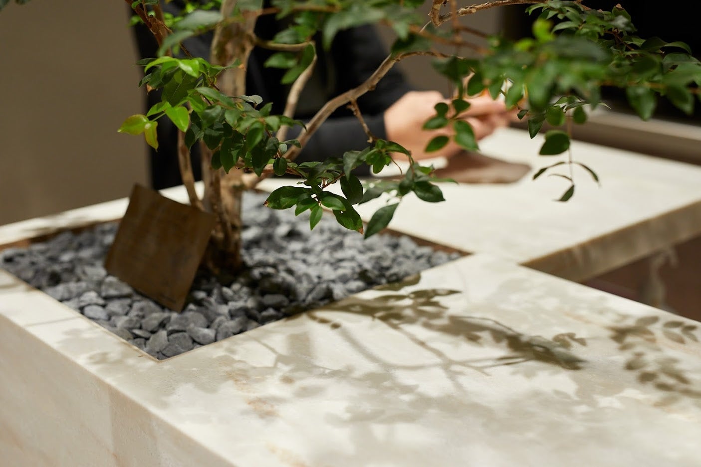 水柱の内側には、東京都八丈島で育ったシェフレラをシンボルツリーとして配置。カーテンから注ぐ木漏れ日の下では水音が流れ、聴覚的にも心地良さを誘います。