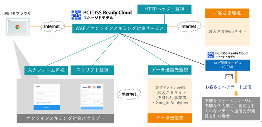 PCI DSS Ready Cloud 「マネージドモデル」との組み合わせによって、要件 6.4.2、6.4.3、11.6.1に対応し、HTTP ヘッダーの不正な変更、コンテンツやスクリプトの改ざん、不正なJavaScriptのふるまいなどを検知し、アラートを送信します。