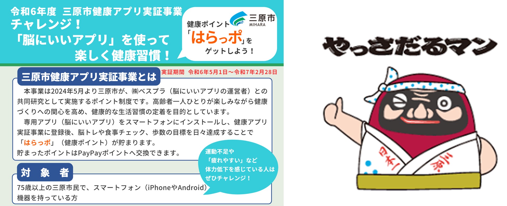三原市健康アプリ実証事業「みはら健康ポイント『はらっポ』実証事業」は、高齢者一人ひとりが楽しみながら健康づくりへの関心を高め、健康的な生活習慣を定着できるよう応援する事業で、当社の『脳にいいアプリ』と健康ポイントサービスを導入してスタートします。