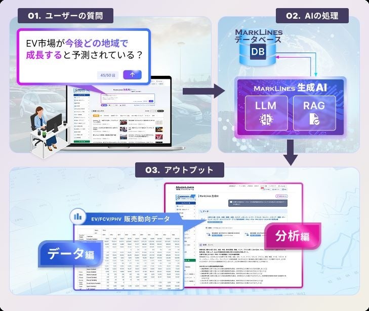 本機能は、当社が保有する自動車関連データから、利用者が自然言語で質問するだけで、必要かつ信頼性の高い「データ」を提示し、更に当社サイト内の豊富な情報を活用して「分析」し、その結果を文章で生成するAI機能です。