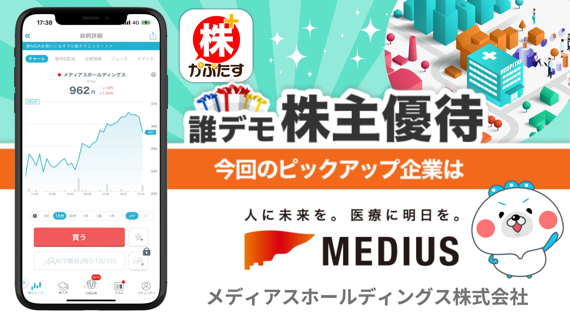 グリーンモンスター株式会社(本社:東京都渋谷区、代表取締役:小川 亮、以下グリーンモンスター)は、体験型投資学習アプリ「株たす」において、メディアスホールディングス株式会社(本社:東京都千代田区、代表取締役社長:池谷 保彦、以下メディアスホールディングス)によるご協力のもと、「誰デモ株主優待」第8弾企画を開始しましたことをお知らせいたします。本企画は「株たす」のユーザーに対し、株主優待制度の魅力を体験しながら学べる機会を提供すると同時に、企業にとっては、新たな潜在株主層へアプローチと自社の魅力を伝える機会となります。