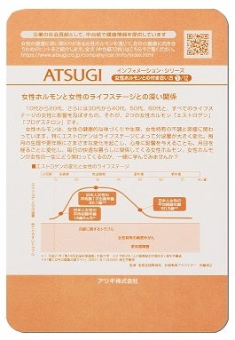 アツギは、CSR活動として2007年より、自社のパンティストッキングの包装材である中台紙に印刷を行い、女性に役立つ情報を発信しています。現在は、フェムテックのムーブメントに合わせて、ストッキングを手に取る皆様に、フェムテックの商品サービスを利用する以前に必要となる「女性ホルモンとの付き合い方」についての情報を提供いたします。具体的には、女性ホルモンがライフステージに与える影響や、自分の身体と向き合うことの大切さが理解できる読み物を、全12話にまとめ、アスティーグの中台紙に印刷し、商品とともに流通させています。実際の掲載内容はアツギ公式ホームページでもご覧になれます。https://www.atsugi.co.jp/company/csr/info/index.html