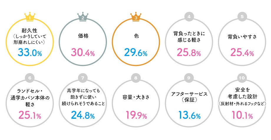 GIGAスクール構想によりタブレット端末やパソコンを持ち運ぶ機会が増えたことで、ランドセルに入れる教材や荷物の重さへの関心が高まってはいますが、6年間使用するものなので「耐久性」が1位という結果に。また「価格」や「色」に次いで「背負ったときに感じる軽さ」や「本体の軽さ」といった「軽さ」に関する項目が重視点として上位にランクインしました。