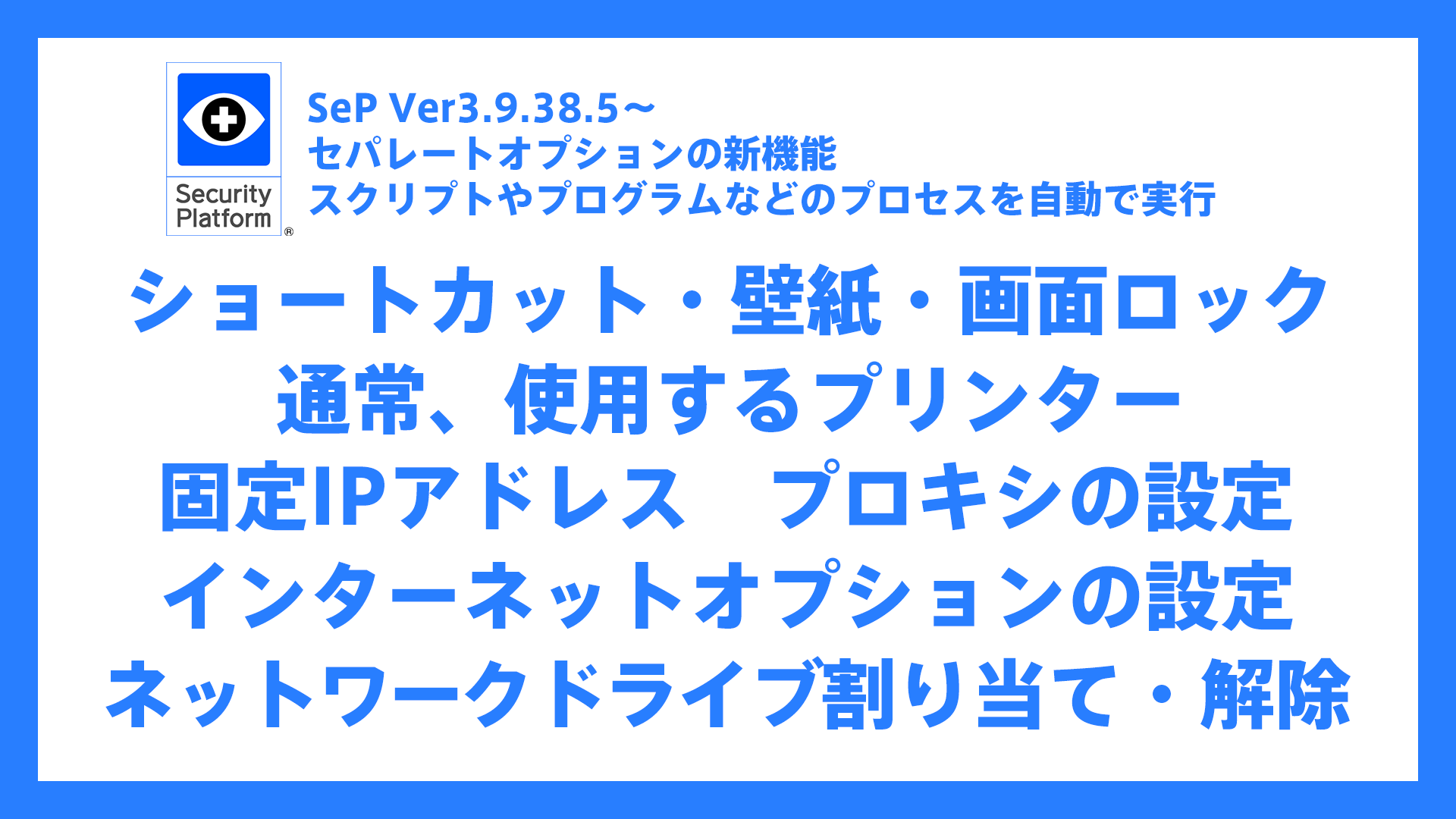 具体的には、ショートカット、壁紙、画面ロック、使用するプリンター、固定IPアドレス、プロキシの設定、インターネットオプションの設定、ネットワークドライブの割り当てなど、SeP以外の様々な設定もできるようになります。