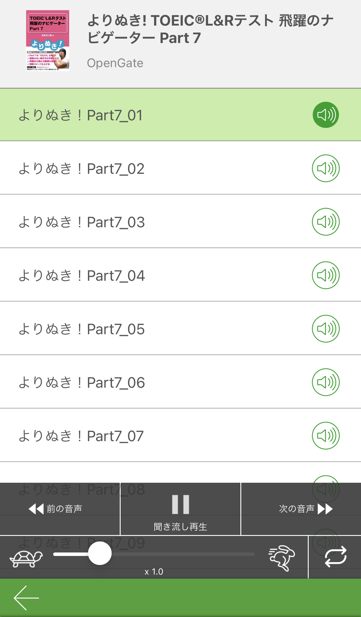 画面の下部メニュー中央に「聞き流し再生機能」のコントロールボタンが表示されますので、聞き流し再生ボタンをタップする事で一番上の音声から順番に連続聞き流し再生が開始されます。また、学習者のリスニング力に合わせてリスニング音声のスピードを変更したり、リピート再生を行う事が可能です。