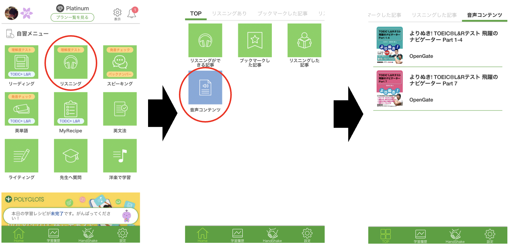 1. レシピーアプリ 自習メニューのリスニングをタップしてください