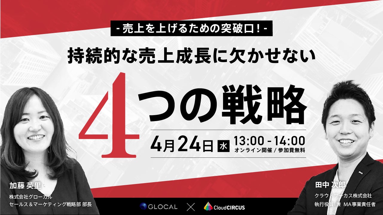 地域の中小・中核企業を対象に経営コンサルティング事業を行う株式会社グローカル(東京都渋谷区、代表取締役:浅野道人)は、マーケティング・営業支援ツールを提供するクラウドサーカス株式会社(東京都新宿区、代表取締役CEO:北村健⼀)と、持続的な売上成長に欠かせない戦略を事例と共に紹介する無料オンラインセミナーを、2024年4月24日(水)13:00~14:00に開催します。