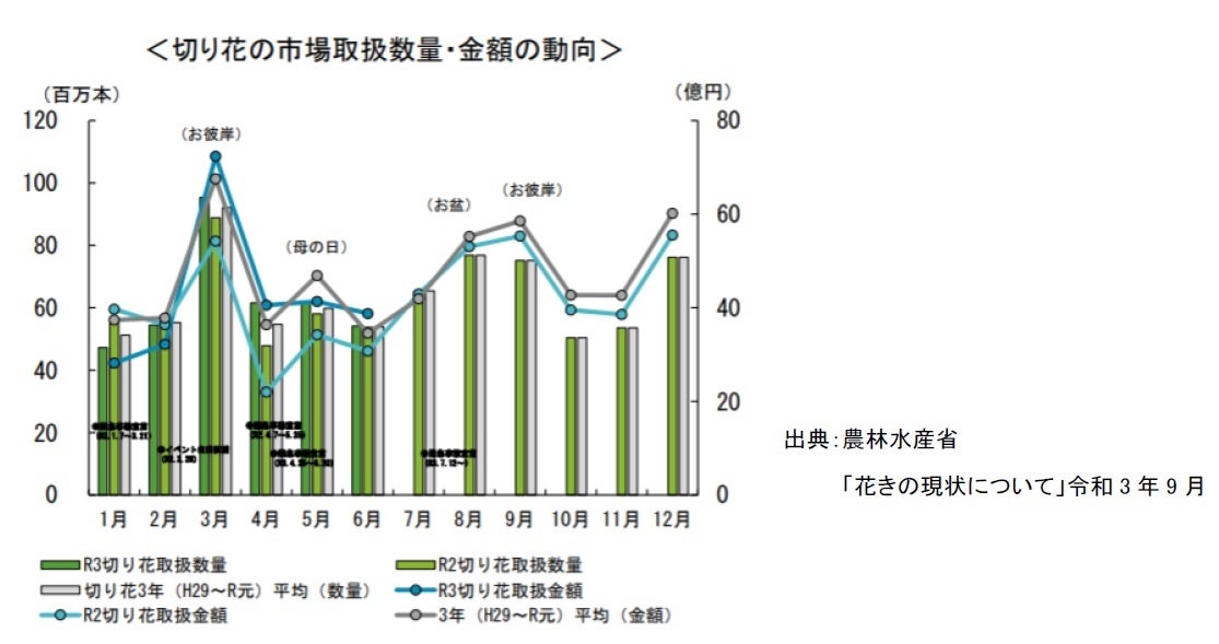 日本では様々なイベントに際して花を消費していますが、新型コロナウイルスの感染が拡大した2020年3月以降、入学式や卒業式、冠婚葬祭など、花を消費する機会が多く消滅しました。特に、2020年3月から5月は緊急事態宣言が発出されていたこともあり、取扱数量が大きく減少しました。(下記グラフ参照)