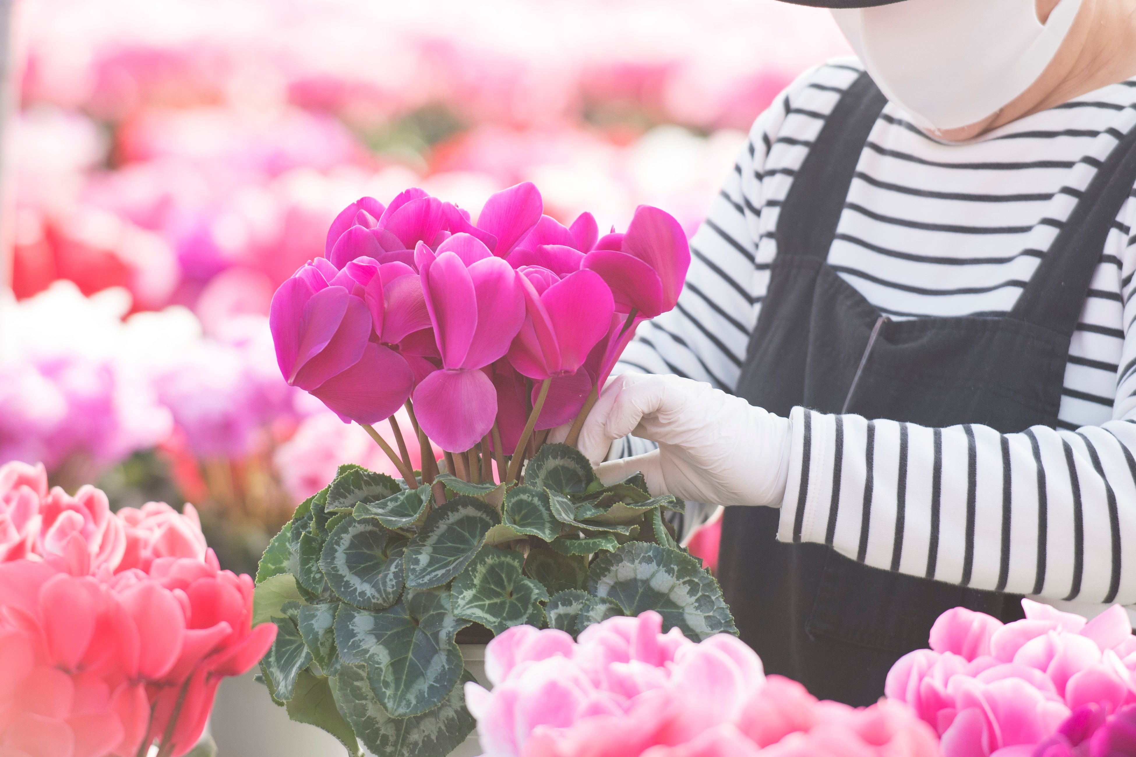 冬に鮮やかな花が開くシクラメン。「さかもと園芸」では通常使用することの多いホルモン剤を使わず、すべて「自然開花」にこだわって栽培しています。ラインナップはタイプ・カラー別に全6種。花の形や色合いが珍しい新品種に、定番種も花弁が丸々として大きく瑞々しいのが特徴です。
