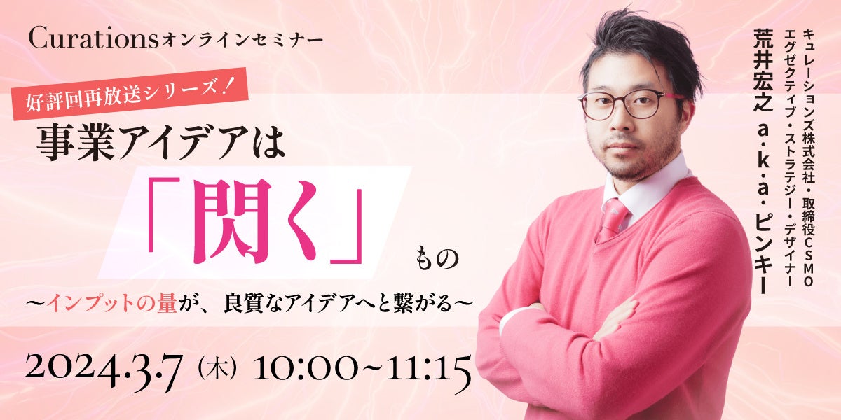 顧客企業のビジネス変革を成功に導くキュレーションズ株式会社(本社:東京都渋谷区、代表取締役社長:根本隆之、以下当社)は、『事業アイデアは「閃く」もの〜インプットの量が、良質なアイデアへと繋がる~(好評回再放送シリーズ!)』を2024年3月7日(木)に開催いたします。