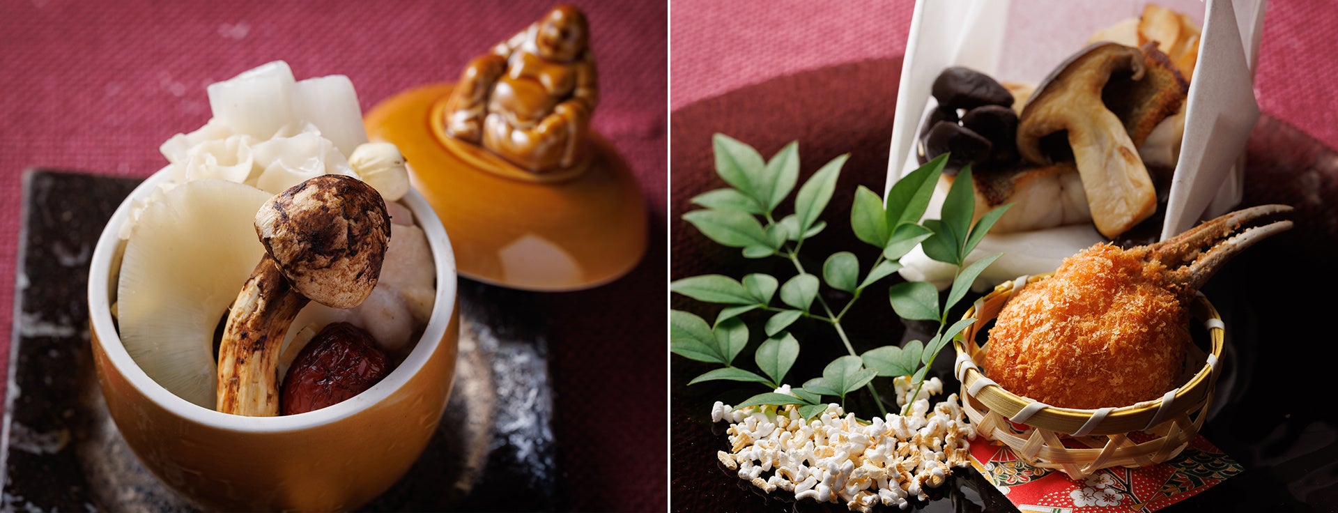 季節の鮮魚をキノコを添えて柚子の香りとともに包み焼きにしました。蟹爪の揚げ物を添えています。揚げたお米の食感もお楽しみください。