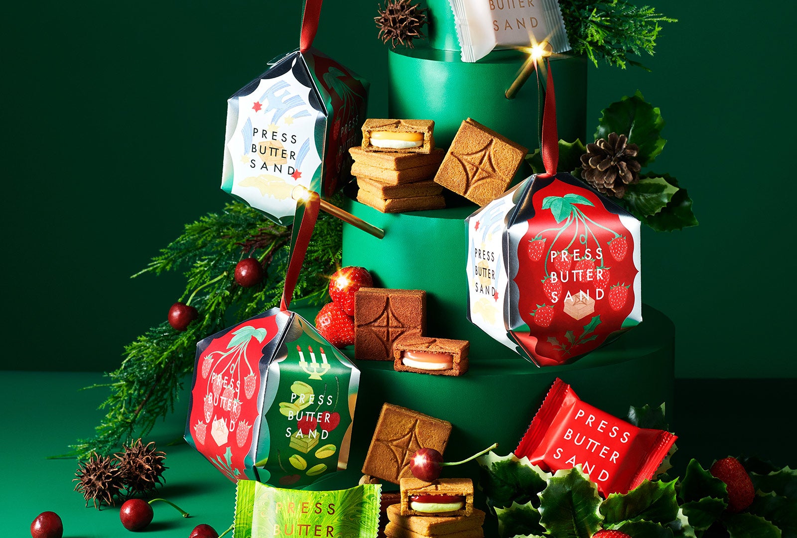 今年のホリデーシーズンは、「バターサンド ホリデーギフト オーナメント」として3種のバターサンドを詰合せました。定番のバターサンドと「バターサンド〈あまおう苺〉」に加え、今年大好評であった「バターサンド〈ピスタチオ〉」も再登場。キラキラ光るパッケージはクリスマスツリーの飾りとしても楽しめます。