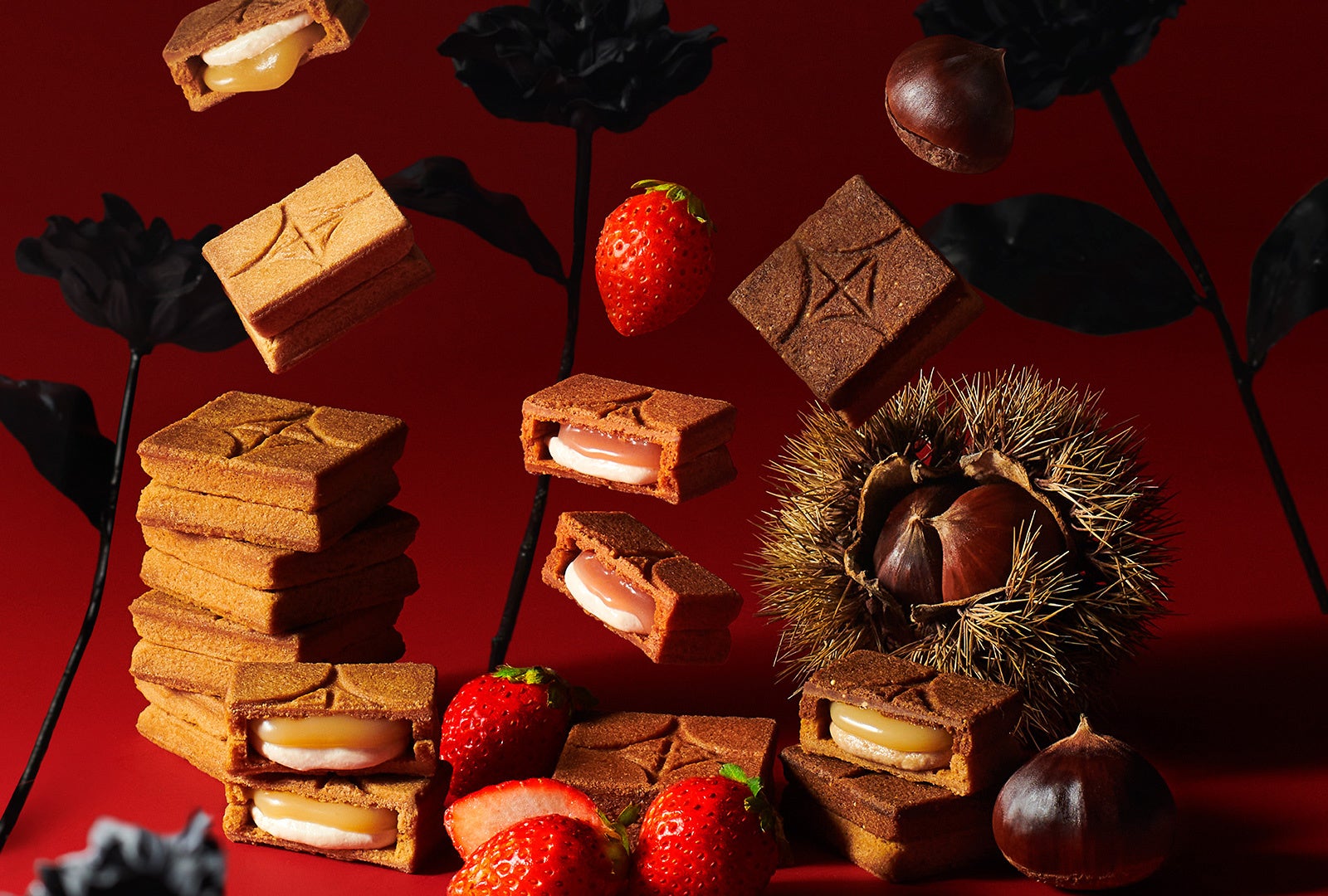 福岡県産のあまおう苺を使った苺バターキャラメルに、香りと風味のバランスがよい、カカオ分70%のクーベルチュールから作られたショコラバタークリームを挟むことで、苺の華やかな甘さにショコラの濃厚な香ばしさが合わさる心地よい味わいに仕上げました。ほろ苦いココアクッキーと優しいベリークッキー2種のバイカラーで見た目も楽しめるバターサンドです。