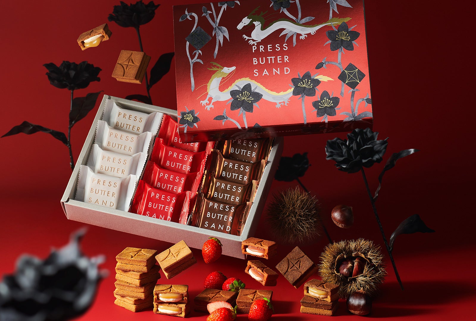 新春を彩る華やかなパッケージデザイン。2024年の干支であるつがいの龍が、バターサンドの花の間をゆったりと泳いで散歩しています。中には福岡県産の「あまおう苺」を贅沢に使用した〈あまおう苺〉、マロングラッセを加えた栗の風味が濃厚な〈栗〉、クリームとキャラメルの2層を挟み込んだ代表商品のバターサンドの3種を詰合せました。紅白とブロンズの個包装が煌めく、年末年始のご挨拶にぴったりの詰合せです。