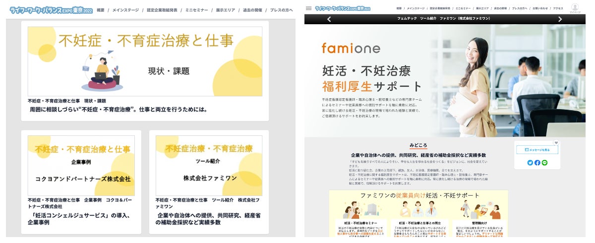 ファミワンによる出展( https://www.lwb-expo.metro.tokyo.lg.jp/exhibitors/lw019 )だけでなく、福利厚生サポートの提供先であるコクヨアンドパートナーズ社による「フェムテック」をテーマにしたミニセミナー( https://www.lwb-expo.metro.tokyo.lg.jp/talks/minis-5 )でも情報掲載されています。