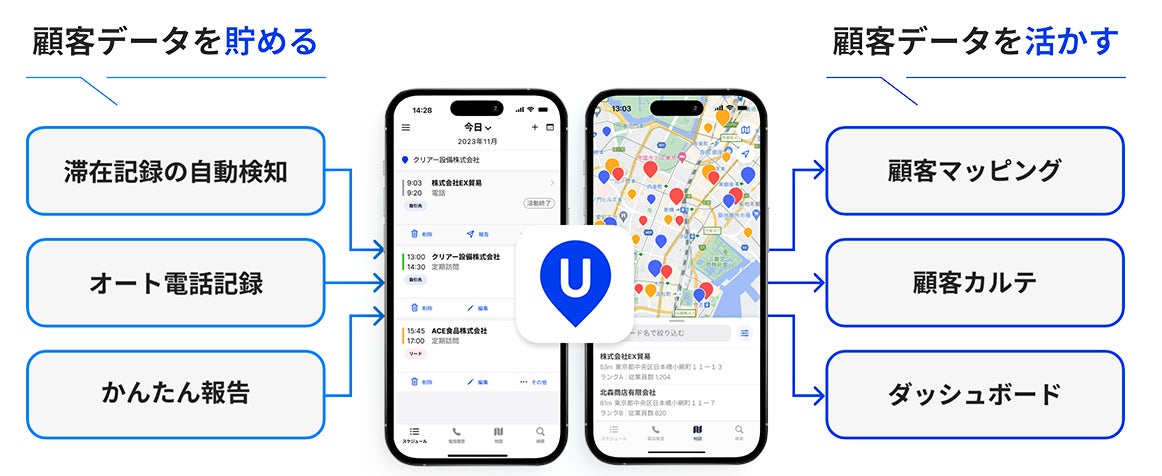 「UPWARD AGENT」では、顧客情報の地図表示や、特許技術である滞在検知によるスマホでの簡単な活動報告を実現しています。訪問時に交換した名刺情報の登録も行えるようになることで、個別のアプリを立ち上げることなく、訪問に伴う業務が全て一つのアプリ内で完結するようになるため、さらなる営業活動の効率化につながります。