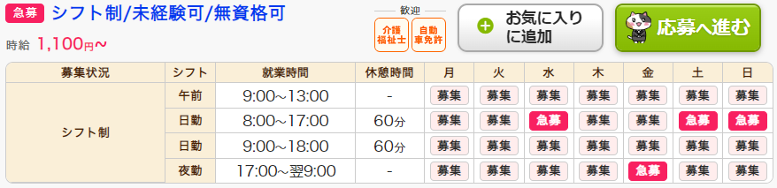 9位の「急募」はシフト別の募集枠がわかる