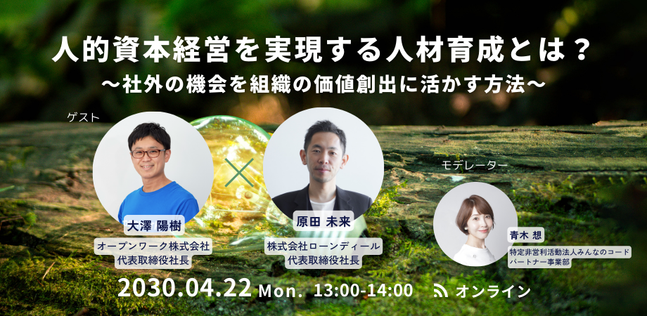 そうした中で、社員の社外での経験や、社会貢献活動を通じて自社のビジネスや人材育成に繋げている企業も増えてきています。そこで、本セミナーでは、株式会社ローンディール 代表取締役の原田未来氏と、オープンワーク株式会社代表取締役社長の大澤陽樹氏をお招きし、具体的な事例を交えながら、お伝えします。