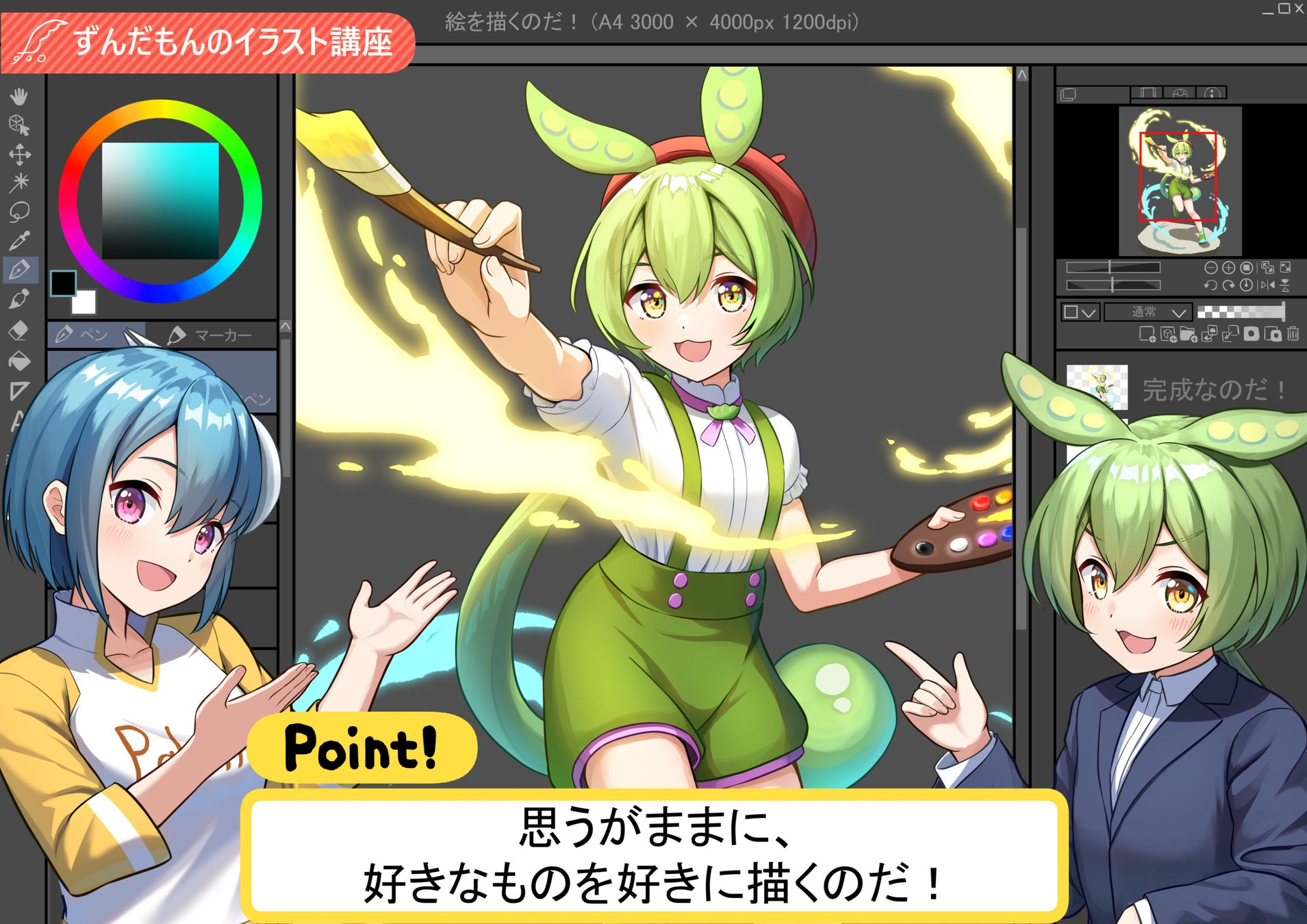 パルミーコラボならではの楽しさが詰まった作品。パルミーちゃんとずんだもんによる講座風イラストという発想がユニークで、見ていて楽しい一枚です。講座動画のレイアウトやお絵かきソフトのUIまで丁寧に再現されており、パルミーの講座の雰囲気がしっかり伝わってきます。ずんだもんのスーパーポジティブ講座、ぜひとも受講してみたいですね!