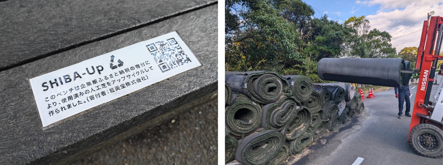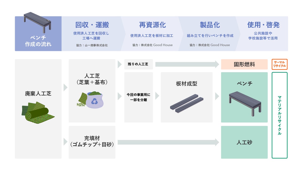 人工芝の回収、運搬においては株式会社山一商事様、今年度の再資源化、製品化においては株式会社Good House様のご協力を経てベンチの制作を行いました。