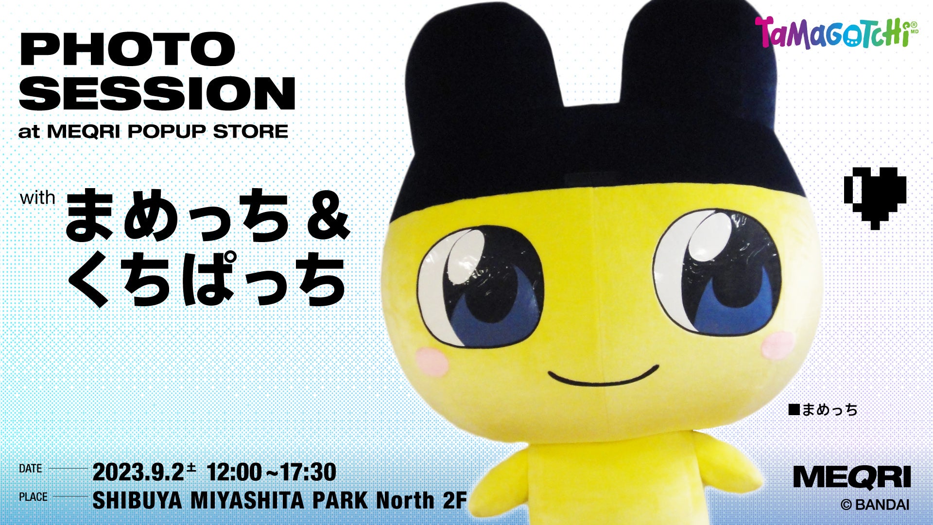 9月2日(土)に、たまごっちの人気キャラクター「まめっち」「くちぱっち」がMEQRI MIYASHITA POPUP STOREに登場。ご来店いただいた方には、まめっち・くちぱっちと一緒に写真を撮影していただけます。たまごっちファンの方はもちろん、大人からお子様までお楽しみいただけるスペシャルイベントです。