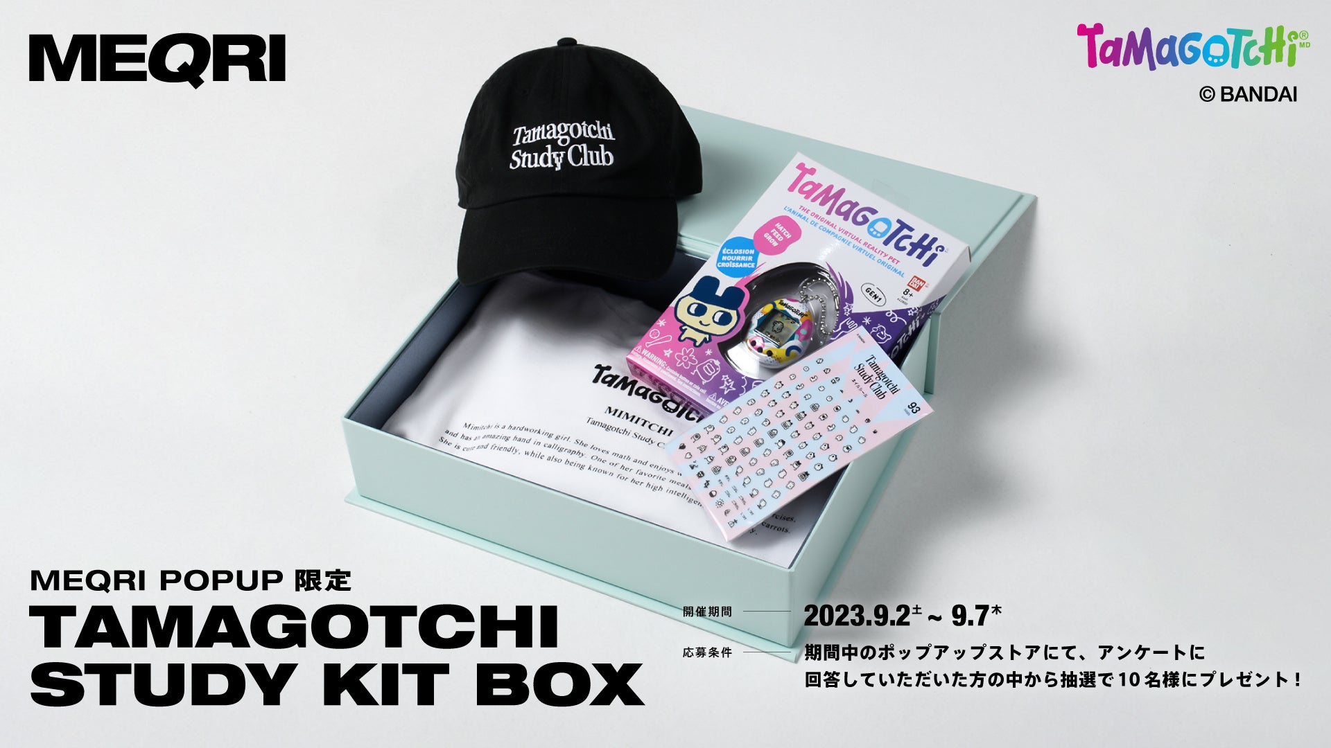 9月2日(土)〜9月7日(木)の期間、MEQRI POPUP STOREにご来店していただいた方を対象に、たまごっち筐体やたまごっちコラボのアパレルアイテムを同封したスペシャルBOX「Study Kit Box」を抽選で10名様にプレゼントいたします。