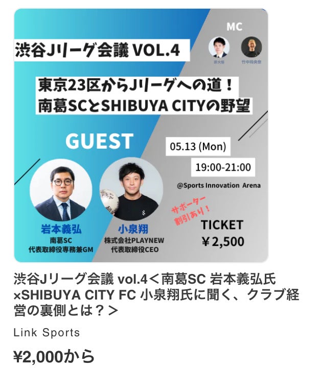 SIAでは、JリーグファンによるJリーグファンのためのトークイベント「渋谷Jリーグ会議」やトップアスリートからスポーツを通じたマインドセットを学ぶイベントを開催しています。