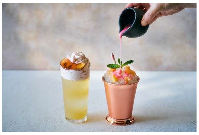 (ピーチインフューズド ラム、ベリーニシロップ、イタリカス、柚子、ピーチシュラブ、ソーダ、ダイスカットピーチ、練乳)