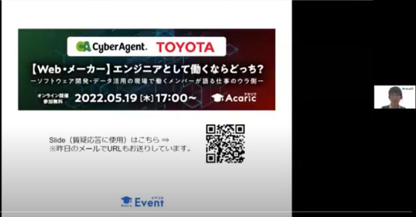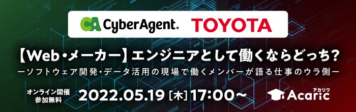 技術者・研究者のキャリア支援に特化した事業を15年にわたって続けている株式会社アカリク(本社:東京都渋谷区、代表取締役:山田諒、以下 アカリク)は、「サイバーエージェント×トヨタ自動車株式会社|異業種対談!【Web・メーカー】エンジニアとして働くならどっち?」と題するイベントを開催いたしました。