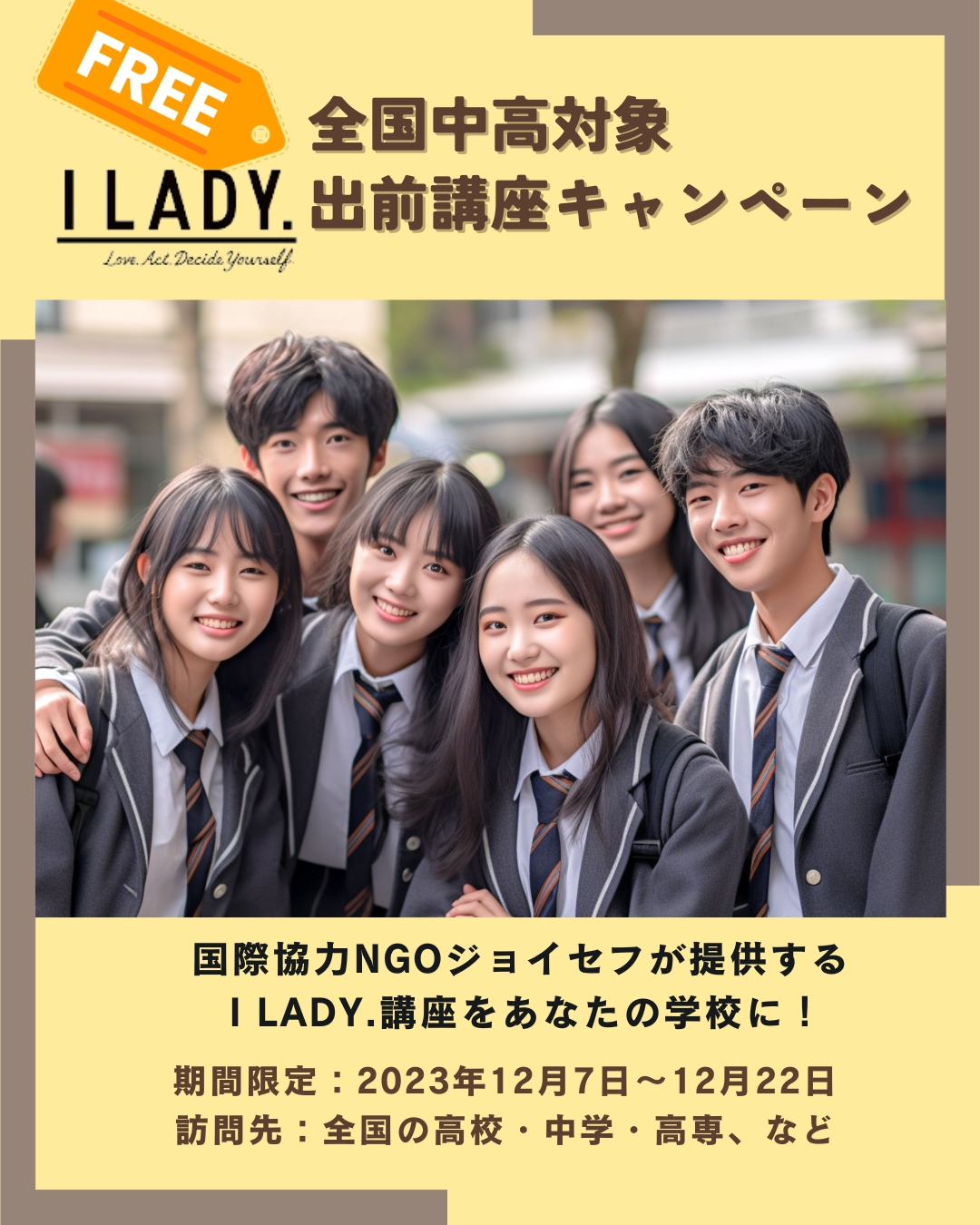I LADY.では、これまでも首都圏を中心に多くの大学等においてI LADY.の講座を開催してきました。このたび、日本全国の中学校・高校において、ジョイセフスタッフが期間・訪問数限定でライフスキルとしてのSRHRを知り、身に着けるための無料講義を致します。