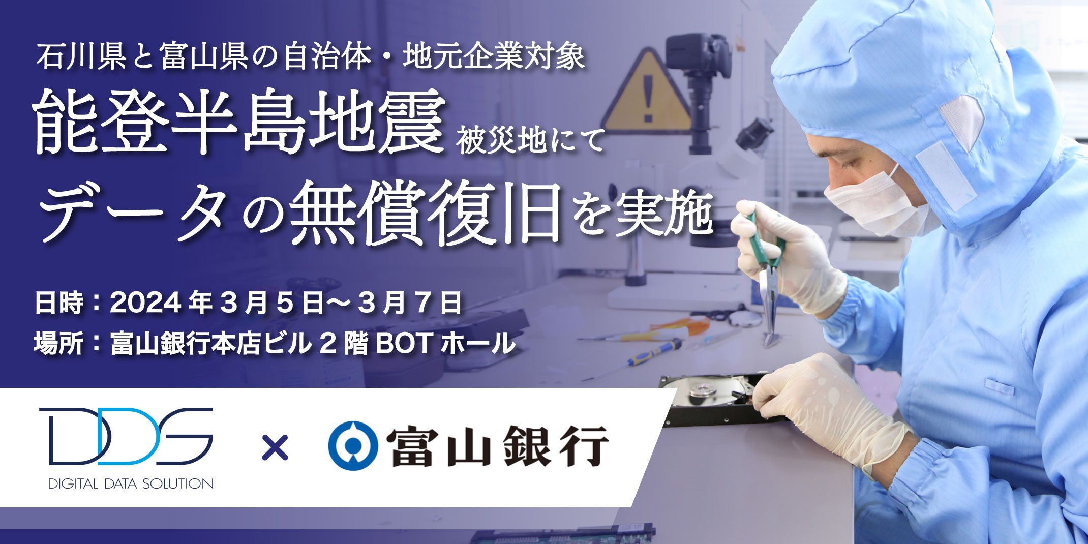 能登半島地震で被災した自治体・地元企業がいち早く運営基盤を復旧できるよう、デジタルデータソリューション株式会社(代表取締役社長:熊谷 聖司)は、株式会社富山銀行(頭取:中沖 雄)と共催で、2024年3月5日~3月7日の3日間、富山銀行本店ビル2階BOTホールにて無償データ復旧の支援を実施します。