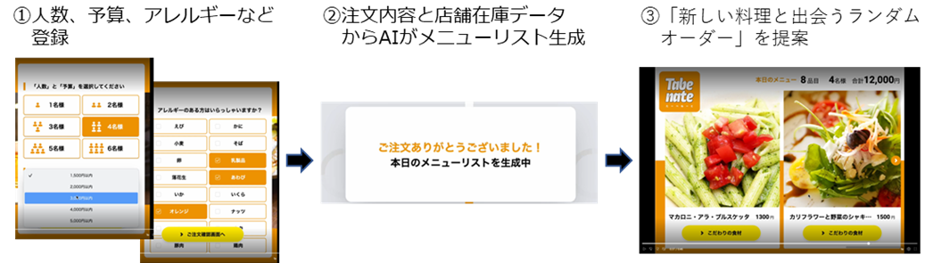 Tabe nateは、今まで知らなかった食材や料理と出会うことで、「食べる」を発見や体験として楽しめるAIアプリです。また、お店の在庫データと連携させることで、在庫の全食材を生かしたランダムオーダーを提案、フードロス削減にも貢献します。