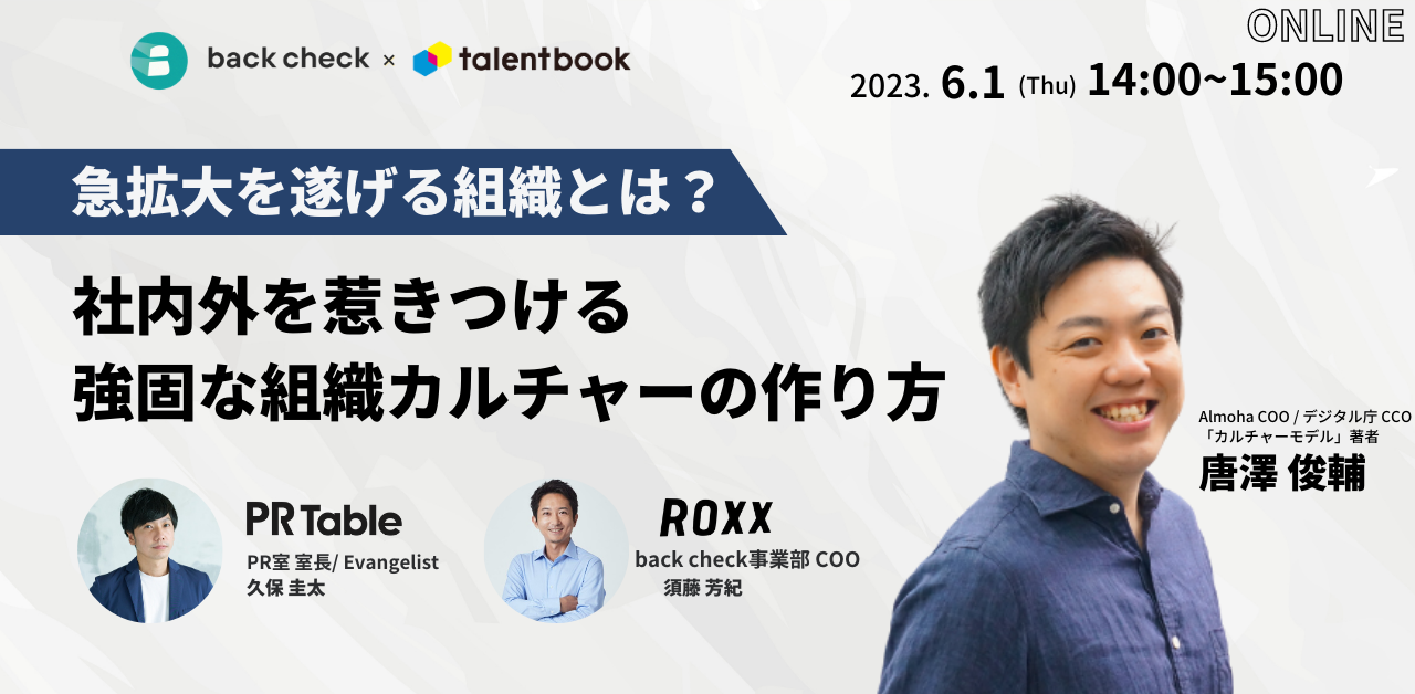 さらにモデレーターとして、株式会社PR Table PR室 室長/ Evangelist 久保圭太氏をお迎えし、弊社 back check事業部 COOの須藤と3名でのパネルディスカッション形式にて、「なぜ、急拡大する組織にカルチャーが必要なのか」や「社内外を惹きつける強い組織になるためのカルチャーの活かし方」などの観点にフォーカスし議論を深めていきます。