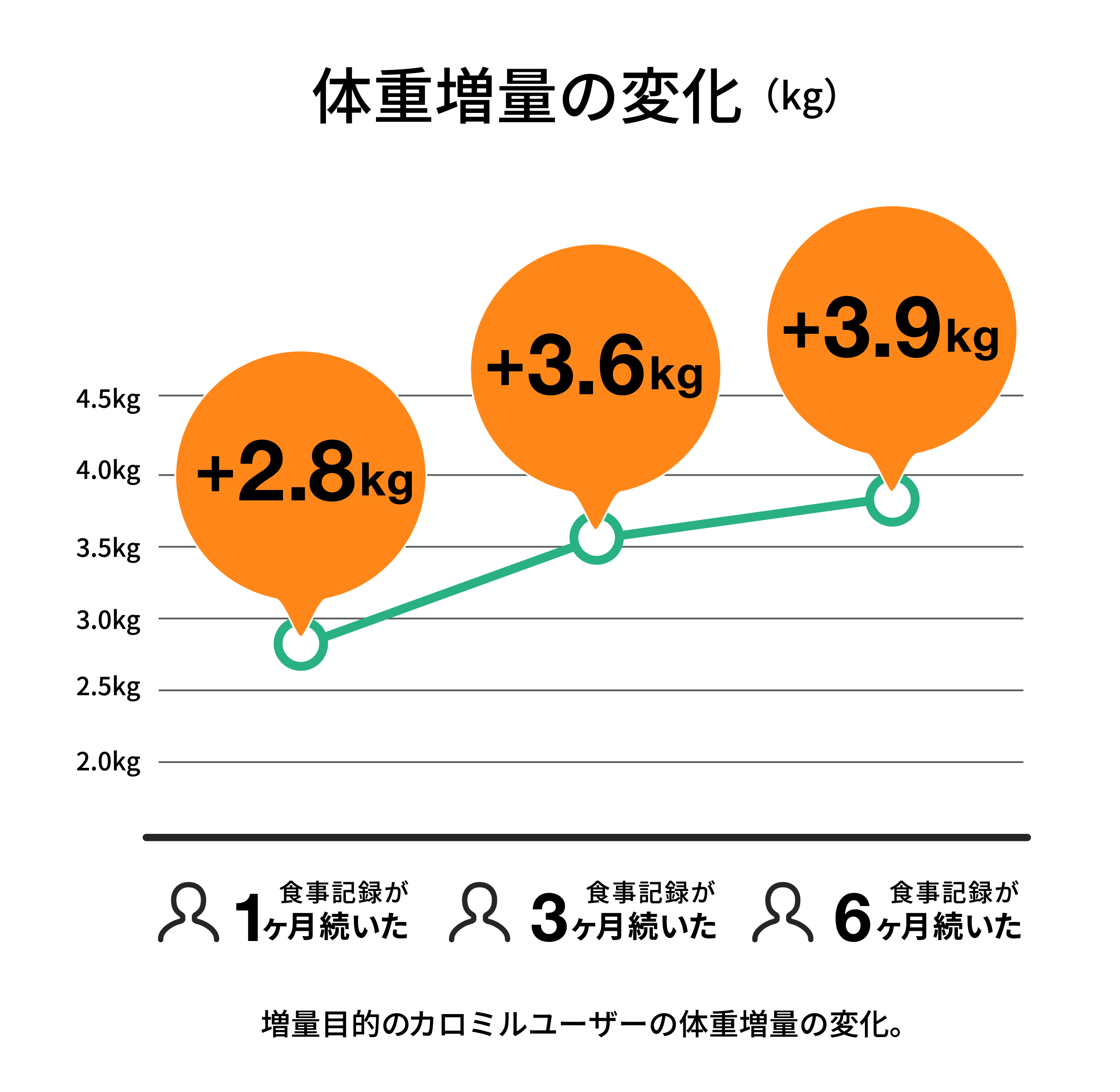 トレーニング等で筋肉増量を目的とされている方など、体重の増量を目的とするユーザーについて調査したところ、継続利用しているユーザーの約7割が増量を達成していることが分かりました。1ヶ月間継続で2.8㎏増、3ヶ月間継続で3.6㎏増、6ヶ月間継続では3.9kg増という結果に。
