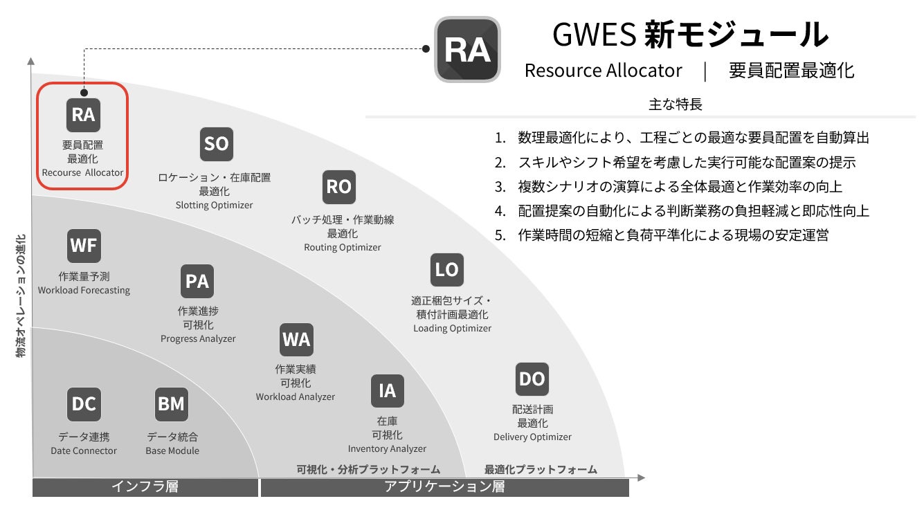 新機能「RA」は、物流施設における作業進捗や工程ごとの優先度、作業者のスキル、勤務予定、シフト希望など、複数の要素を基に、数理最適化技術を用いて数万通りの要員配置シナリオをリアルタイムでシミュレーションし、個人単位で最適な配置を提示する機能です。