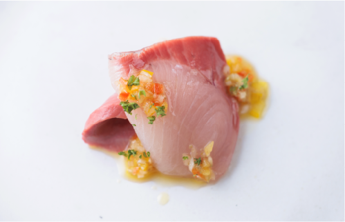 脂のりが良い腹身とさっぱりした味わいの背身を、特製ドレッシングで和えました。部位による味の違いを楽しめます。