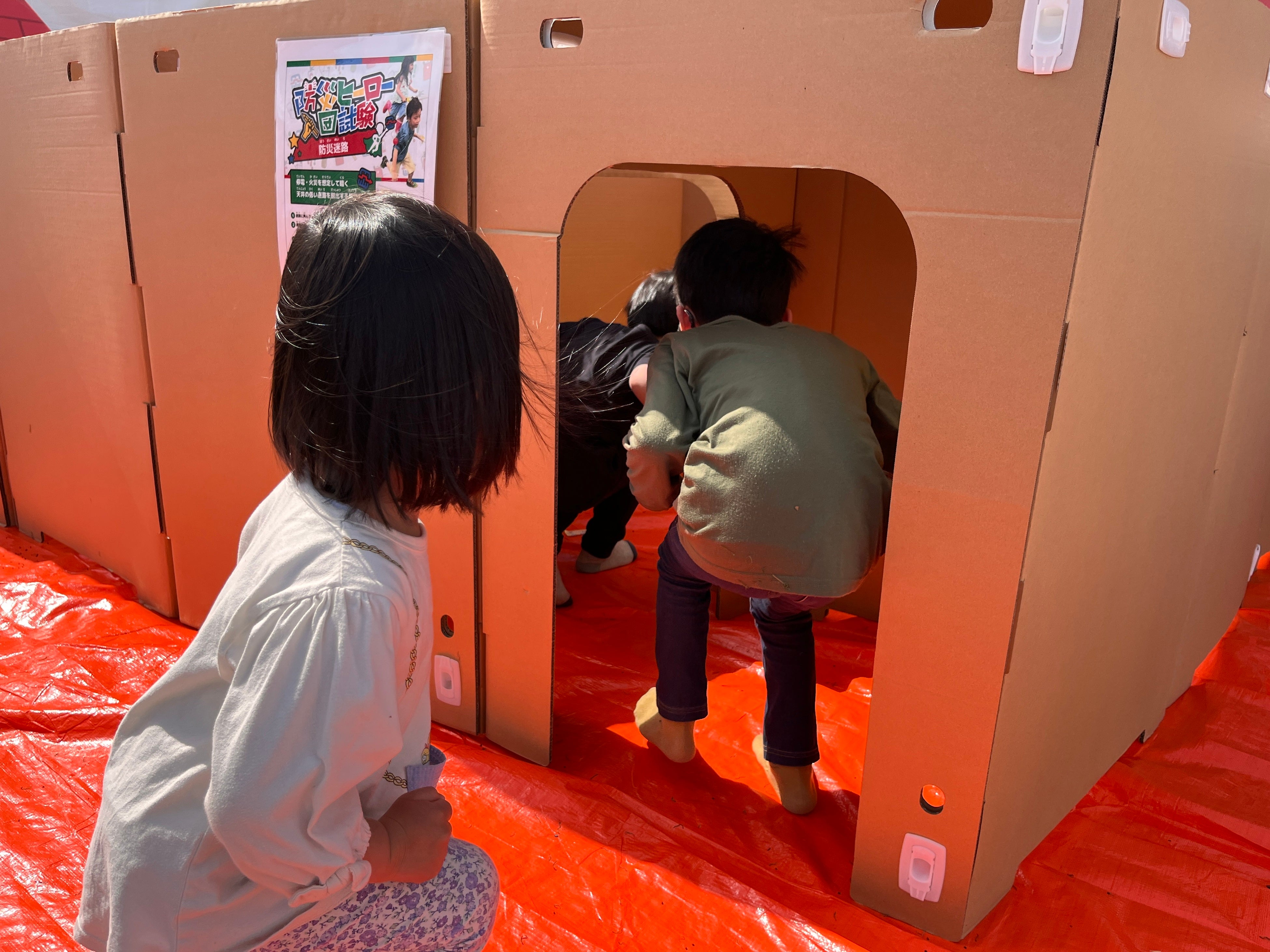 停電などを想定した暗いダンボールの迷路内には、防災に関する様々なクイズが!