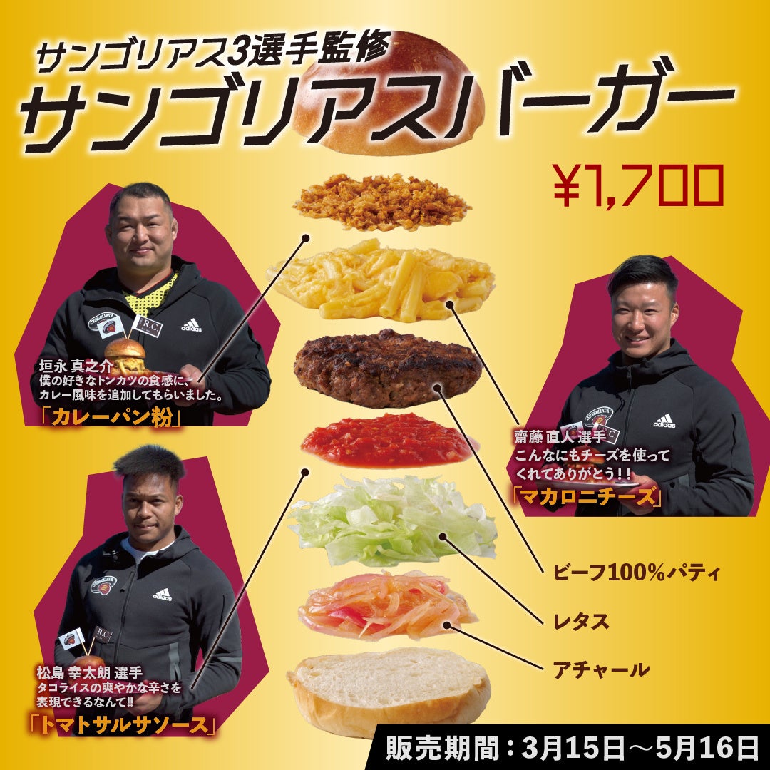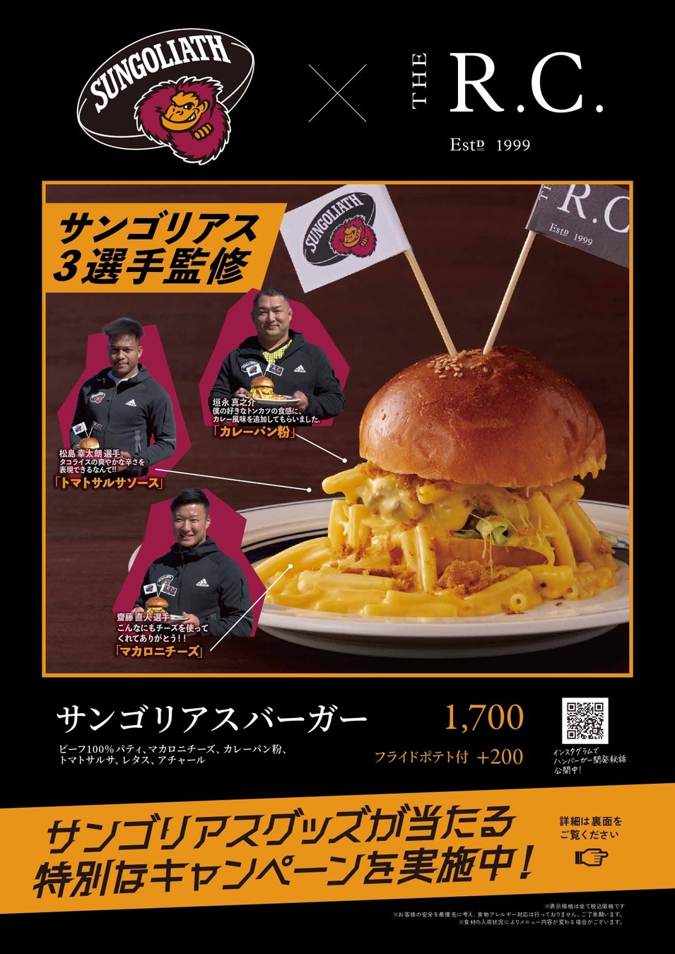 現在『THE R.C. AMRS』では、社会人ラグビーチーム『東京サントリーサンゴリアス』の試合を店内で放映する「MONDAY RUGBY」イベントを開催しており、このたび『東京サントリーサンゴリアス』に所属する3選手が監修する「サンゴリアスバーガー」の販売が実現しました。